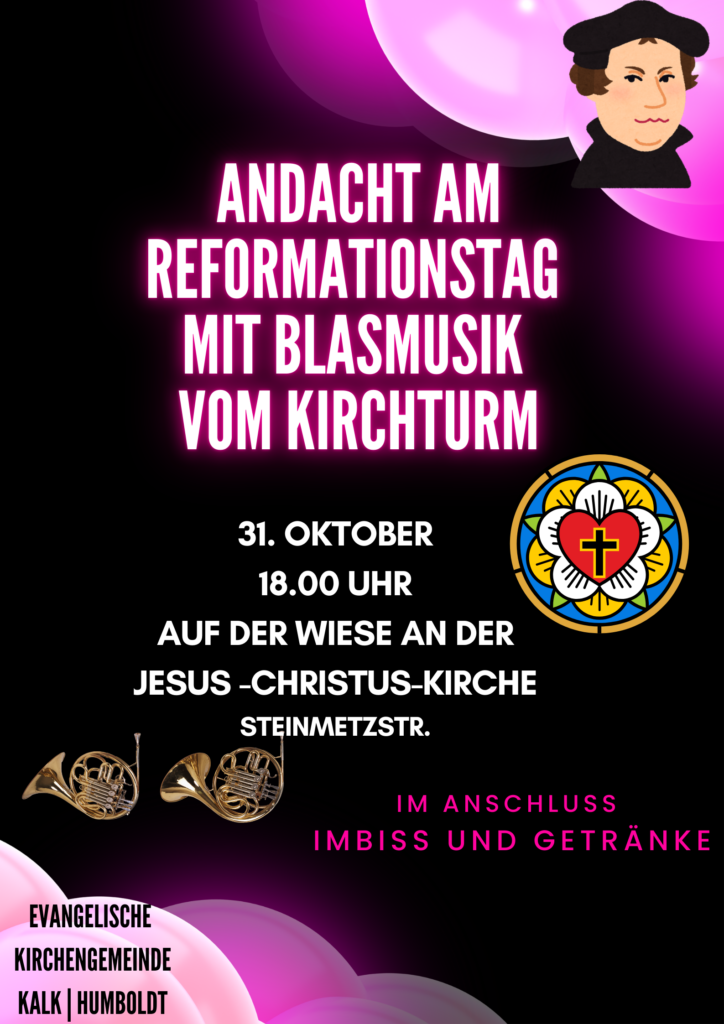 - Andacht am Reformationstag, 31.10.2025 um 18.00 Uhr an der Wiese der Jesus-Christus-Kirche – mit Blasmusik vom KirchturmIm Anschluss Imbiss und Getränke