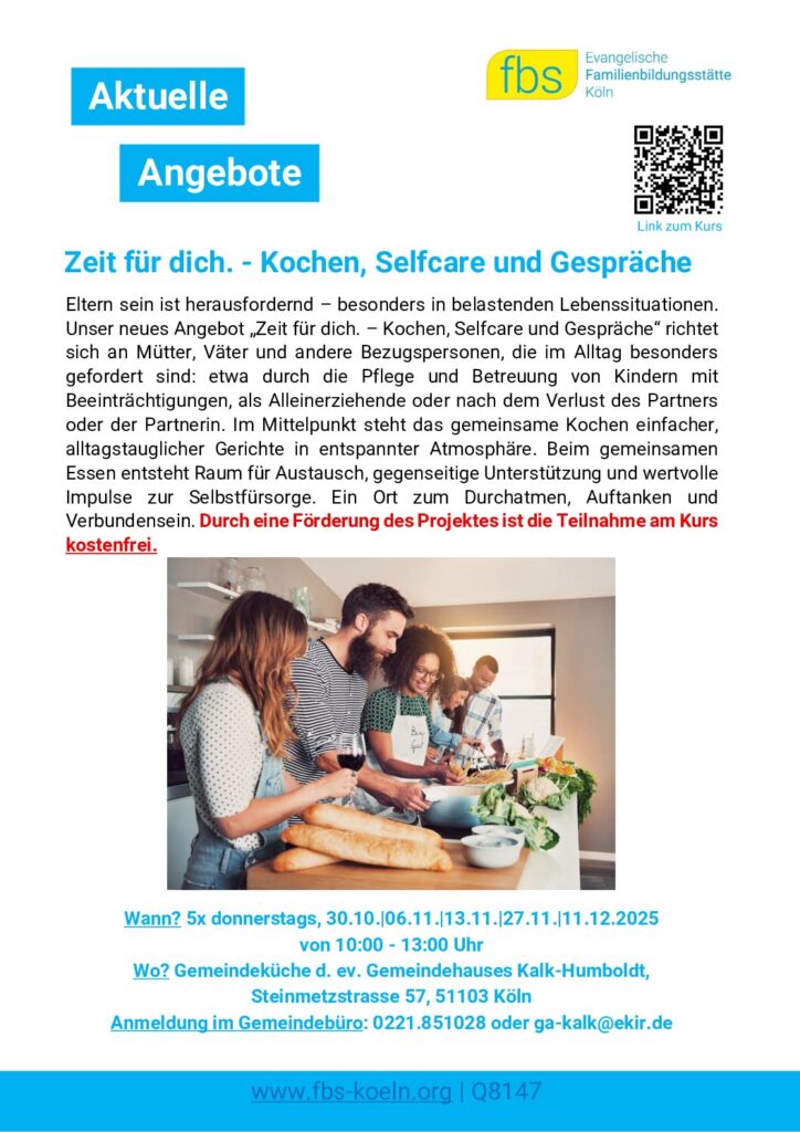 - Zeit für dich. – Kochen, Selfcare und Gespräche. Donnerstags von 10.00 bis 13.00 Uhr Gemeindeküche, Gemeindehaus Steinmetzstr. 57