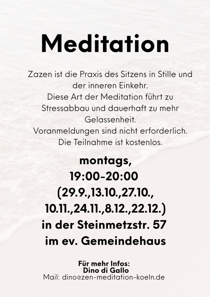 - Meditation jeden zweiten Montag – alle Termine 202525 Minuten Stille – und im Anschluss die Möglichkeit, kurz… Meditation jeden zweiten Montag – alle Termine 2025 weiterlesen